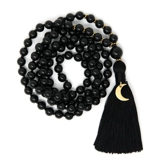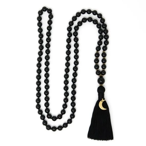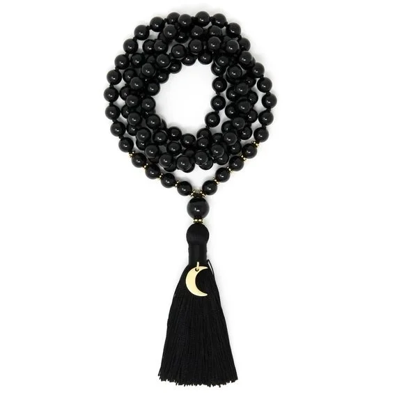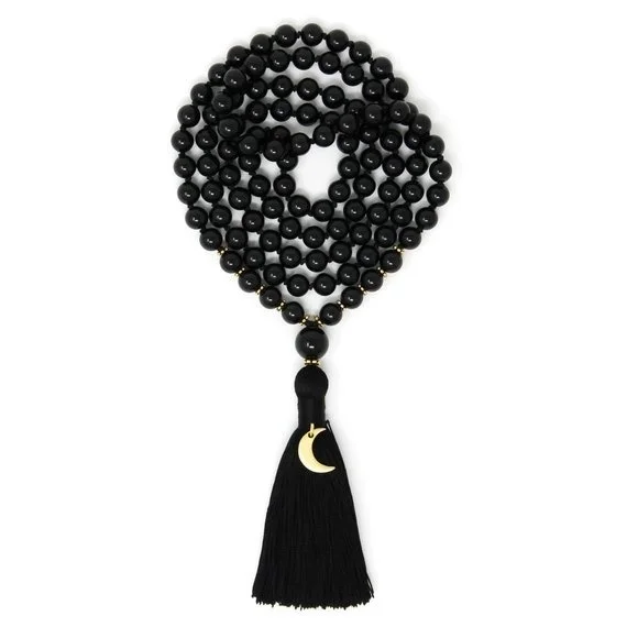 Colar Japamala de turmalina preta, com nós, e 108 contas de oração budista.