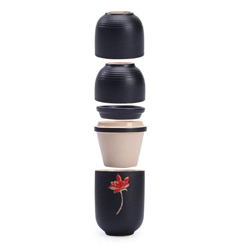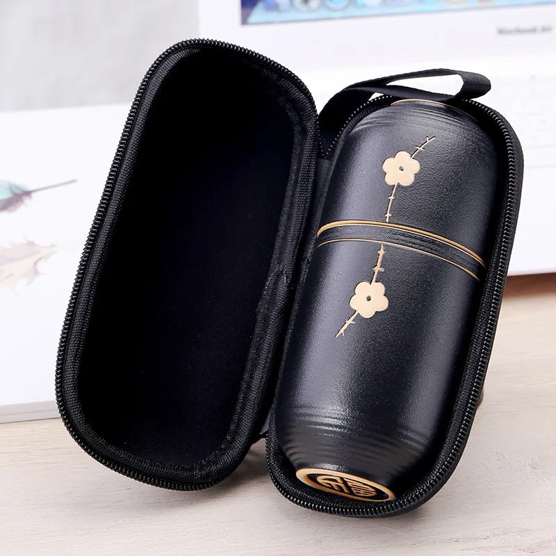 Lindo Jogo de Chá Portátil Japonês, para você beber seu delicioso chá aonde quiser. Em cerâmica preta, delicadamente pintado à mão, com case.