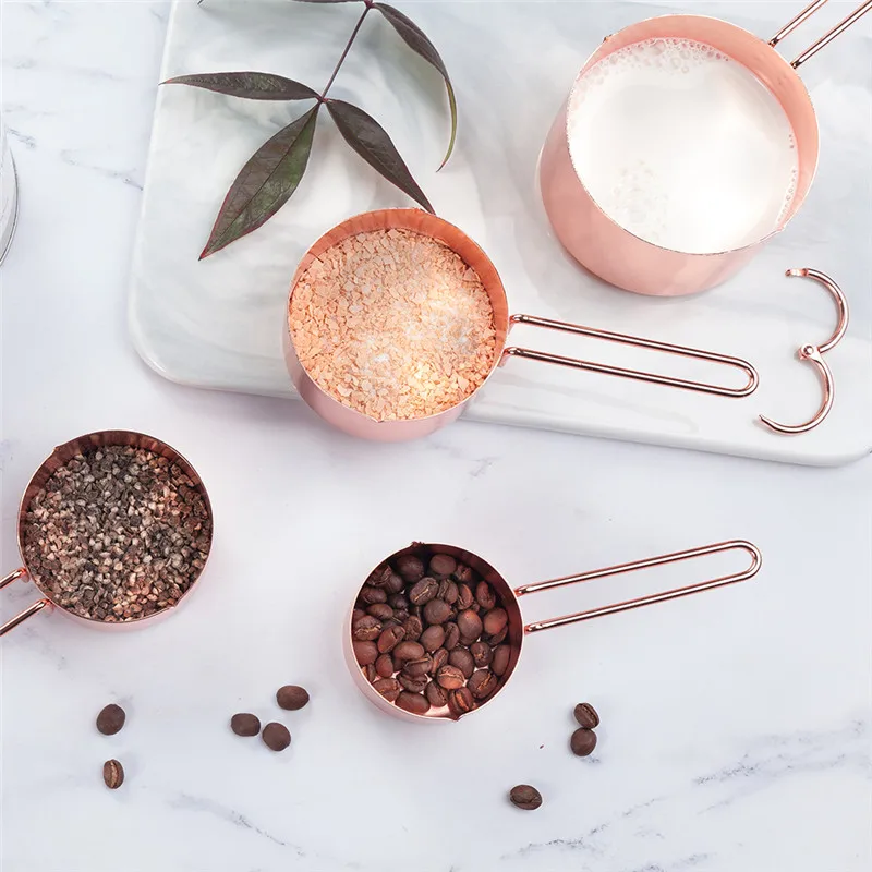 Conjunto de medidores em aço inoxidável polido. Com bicos de derramamento que facilitam a utilização. Excelente para medir ingredientes secos, líquidos, finos ou grossos. Chapeados em cobre. Para cozinheiros, chefs, padeiros ou qualquer um que gosta de cozinhar ou assar. Ecologicamente corretos.